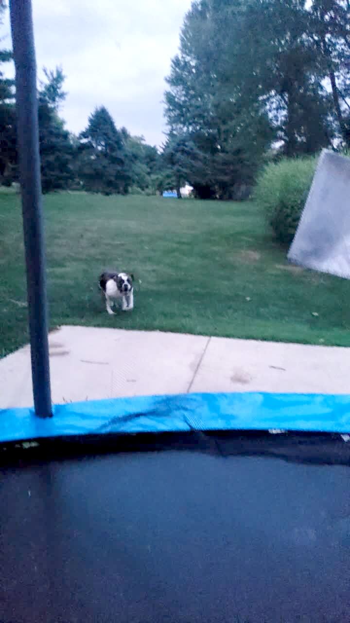 A dog runs through the backyard and crashes into a fence. It breaks. Security Footage.