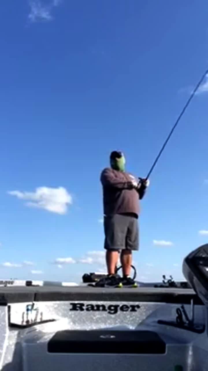 A woman slips off the side of a boat while fishing with a man on a lake. He helps her out and says "I wondered how long that would be before that happened."