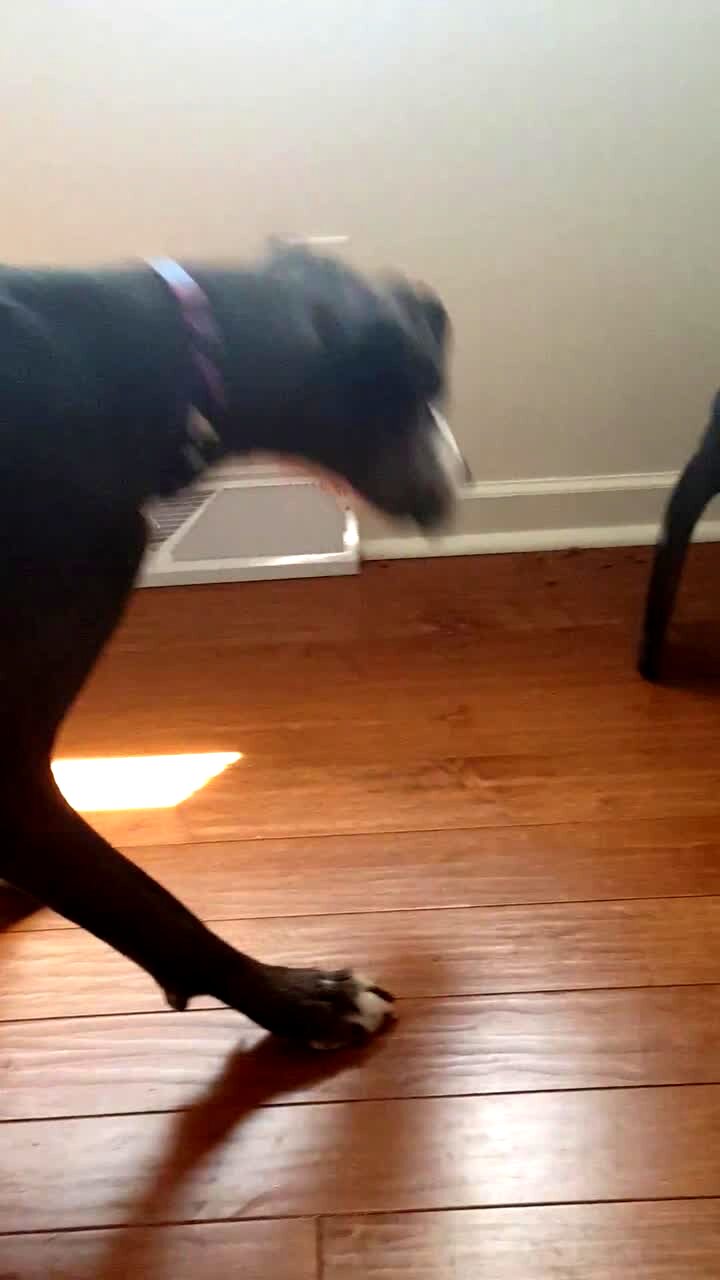 A Great Dane Dog acts wary of a new raised food and water bowl stand.