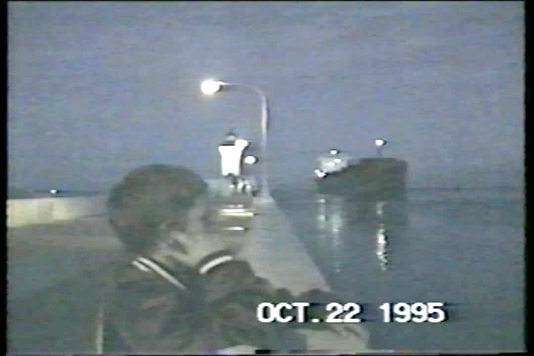 Boy on a shipyard dock in evening introduces himself to the camera. Suddenly a huge ship's foghorn blasts and startles him.