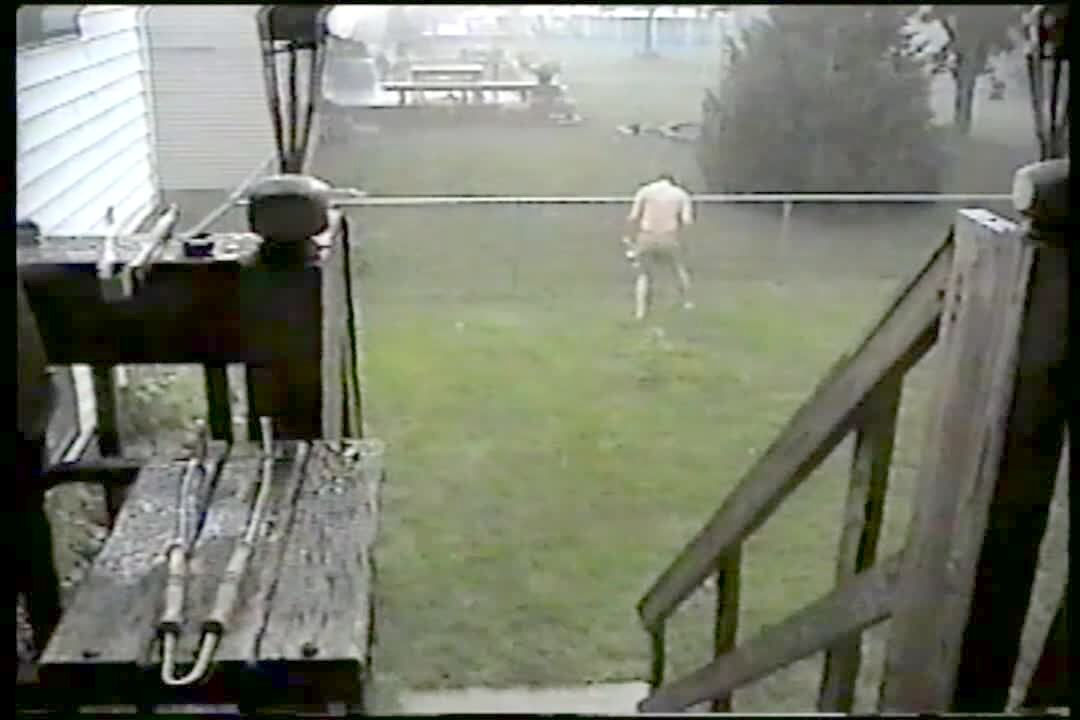 Tot girl yells at the thunder to shut up when she stands in her backyard during a thunderstorm.
