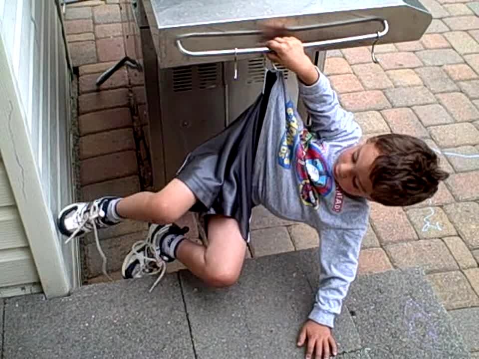 Little boy gets his shorts stuck on hooks attached to the grill cart. He hangs there. Back patio.