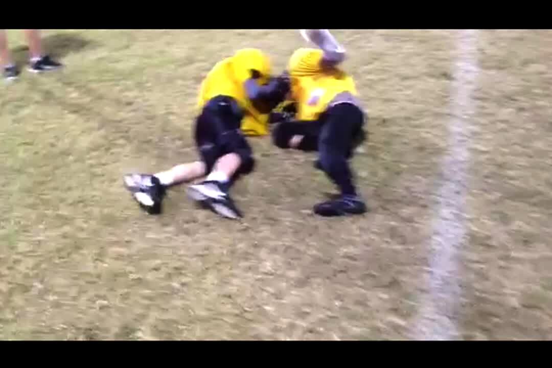 Two boys play pee wee football together, doing a tackling drill. They get their face masks stuck together and fall down on their field.