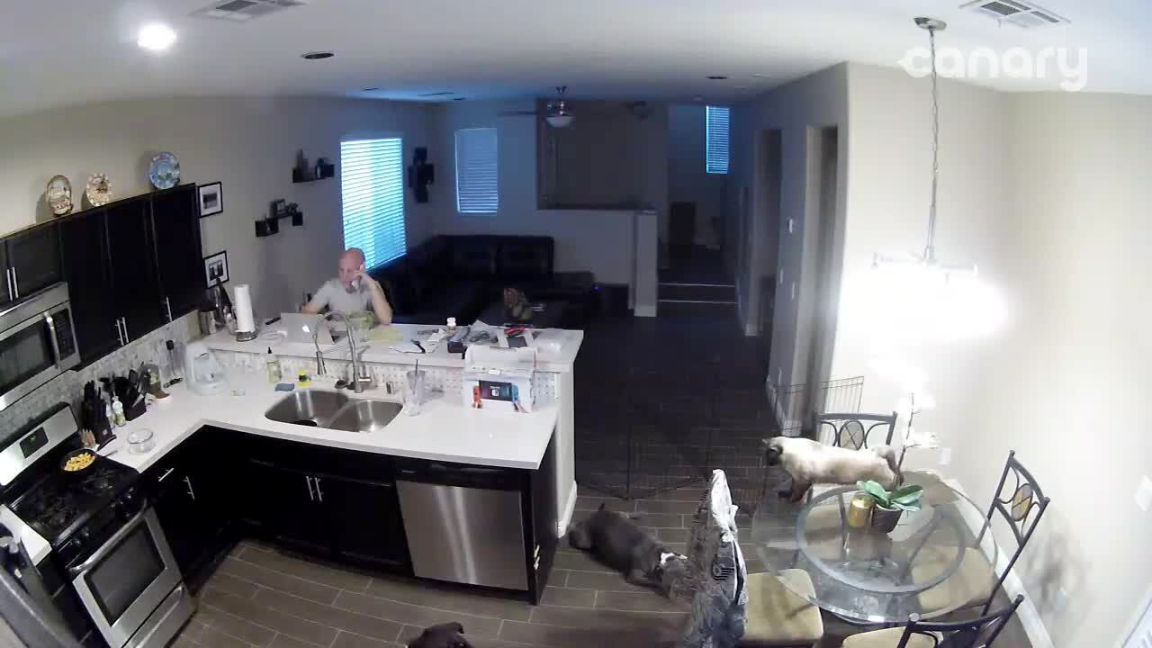 A cat jump from a table to a kitchen counter and knocks multiple glass objects off of it, then jumps onto a ledge in a living room. A man on the phone on a barstool swears at the cat. Security camera footage.