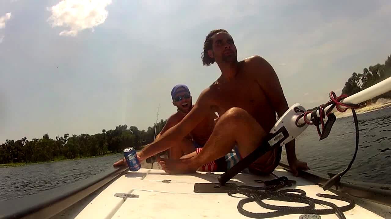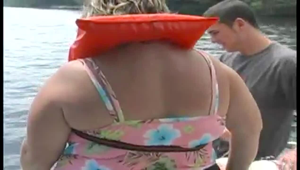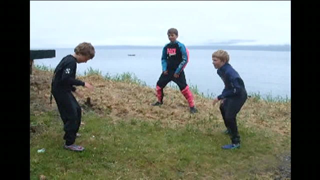 At 0:22, a man jumps on the blob to launch another guy into a lake but he just ends up bouncing himself in the water.