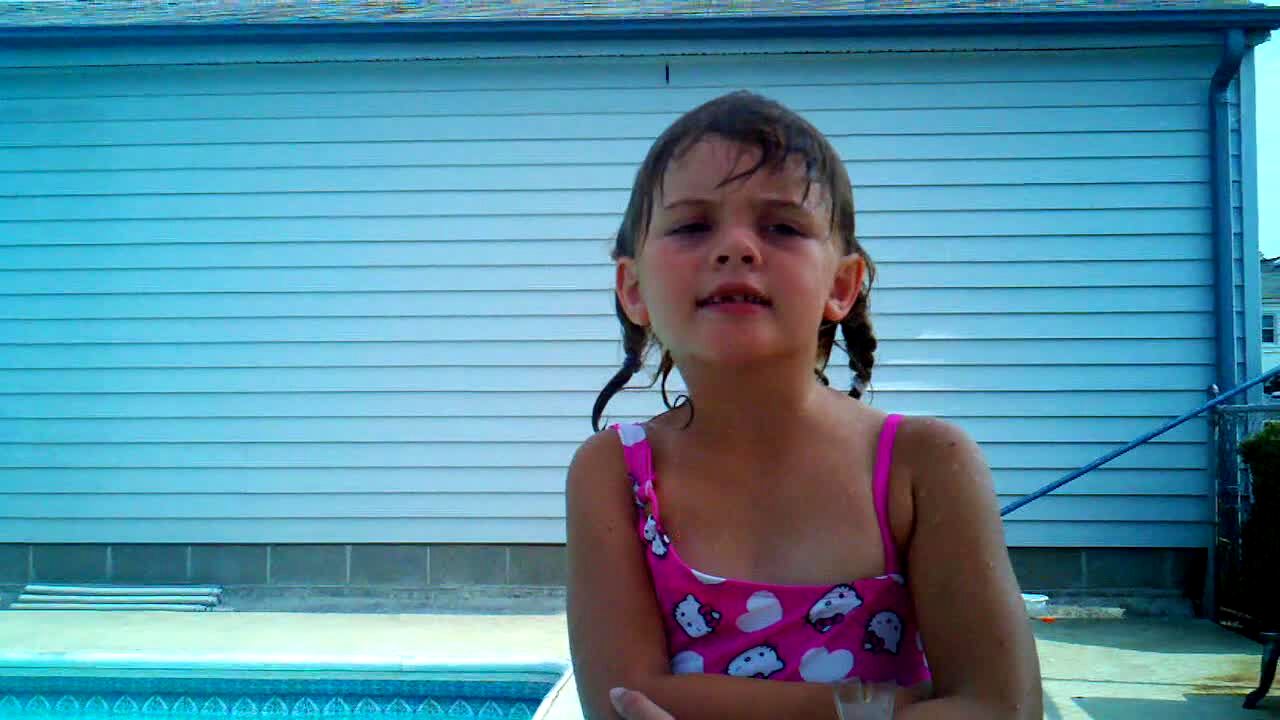 "Little Scene Stealer" A little girl is trying to record a video for her dad by pool. Her tot sister starts babbling and little girl folds her arms and impatiently waits for her to finish. "When is she gonna stop?"