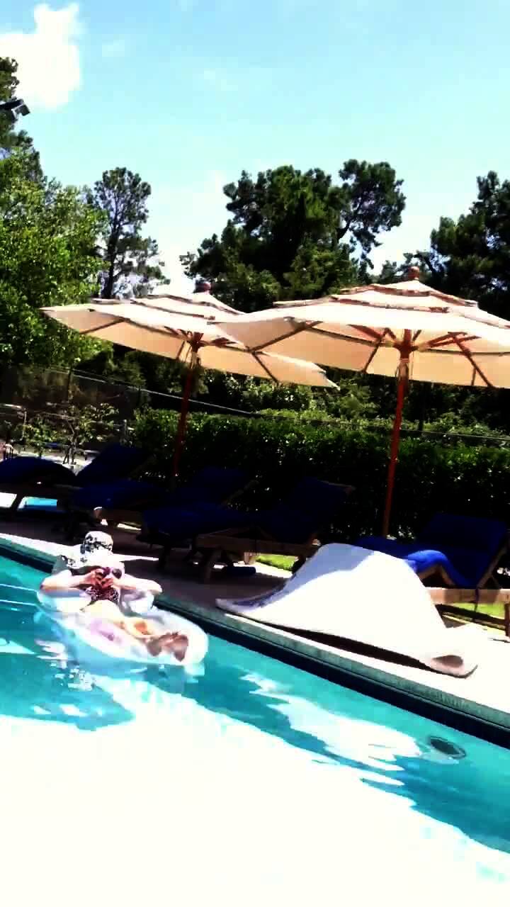 A teen girl is laying on a raft in a pool. Her brother throws a frog on her and she freaks out.