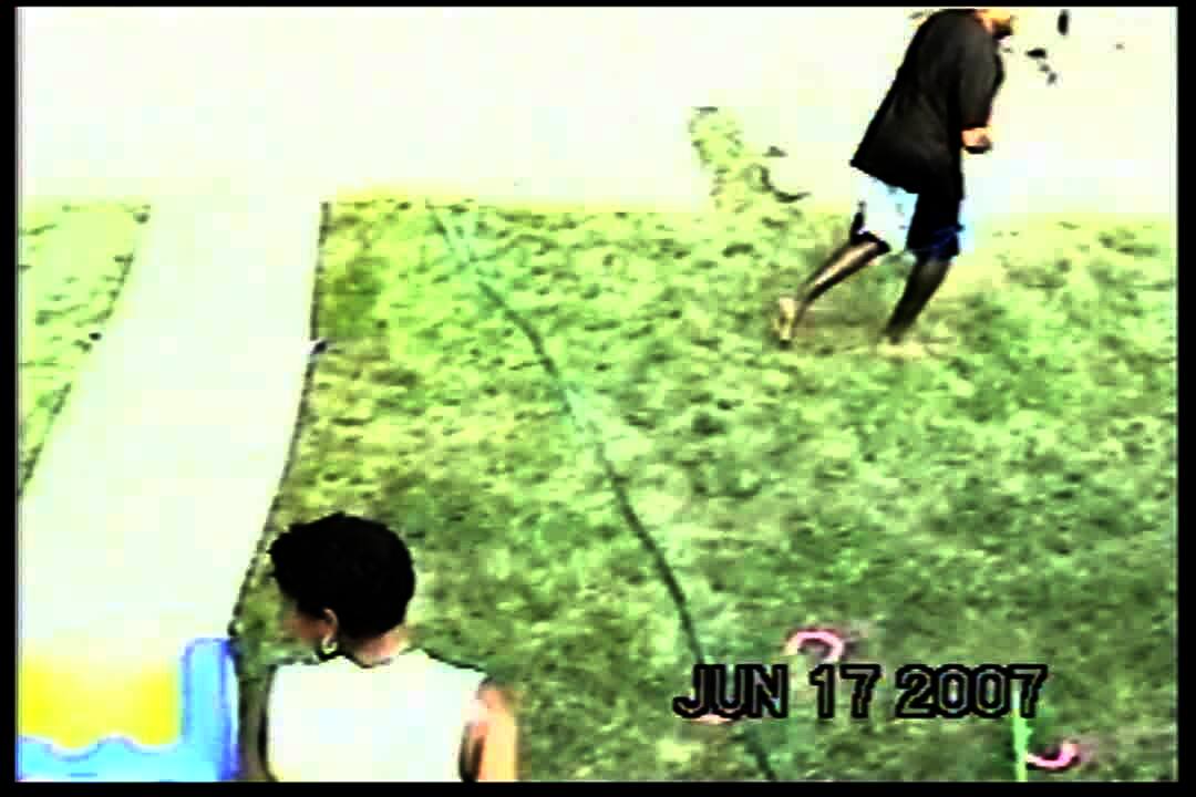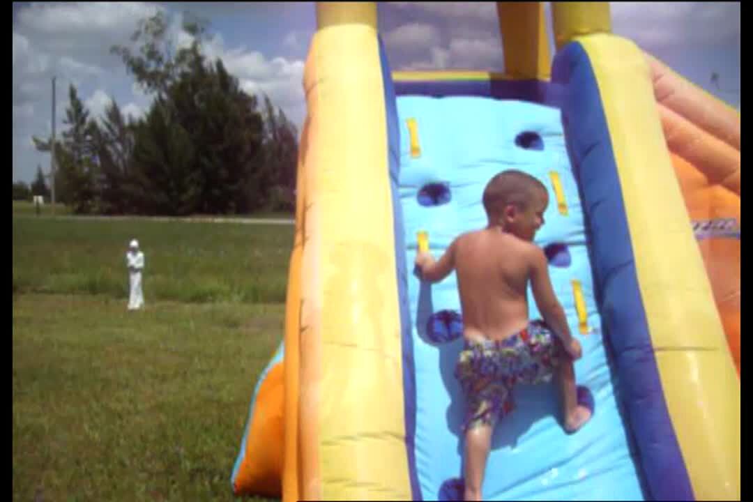 A woman tries to slide headfirst on a slip n' slide at 2:02 and drags the slide with her. She tries again at 2:55 and slides beyond and over the edge.