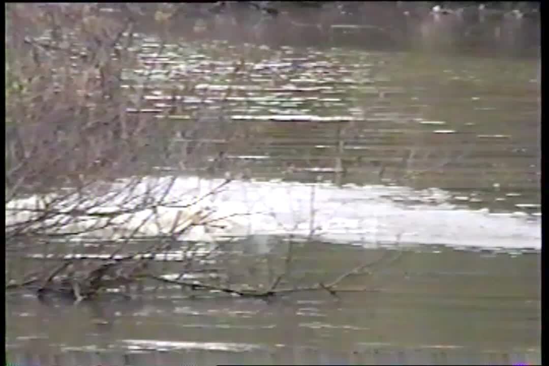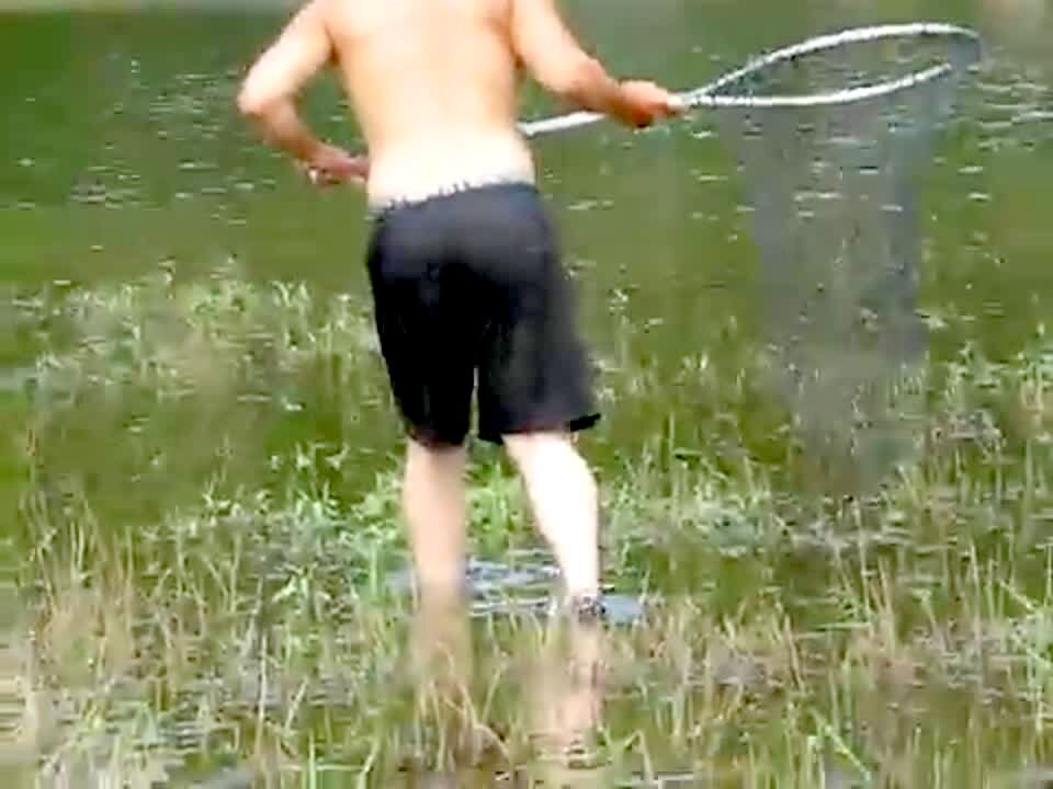 Man wearing scuba goggles waits patiently to catch a fish with a net, then belly flops into the river to grab it. He succeeds. Long for edit.