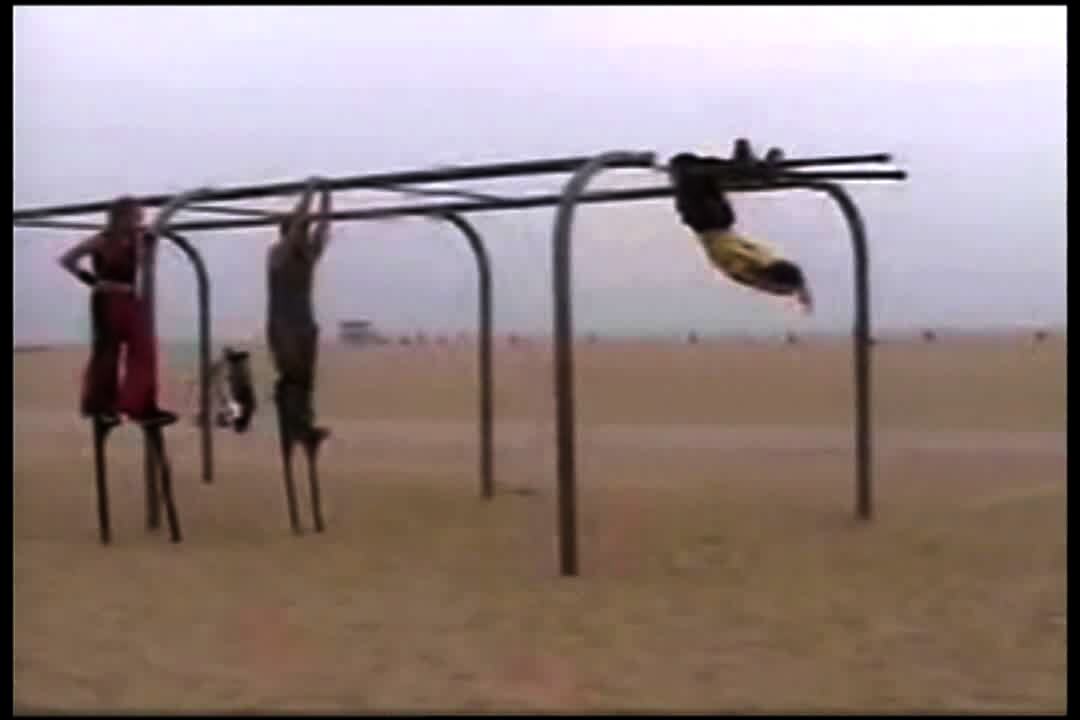 Man hangs by his knees from the monkey bars while wearing stilts. He back flips off the bars & lands but falls when trying to walk away in the sand. Beach. Playground. .