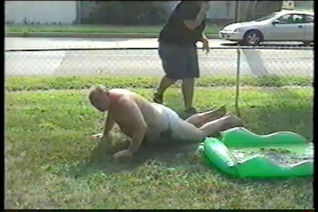 Big man tries to stand up and slide down slip and slide. He falls and hits his head on the ground. No tail.