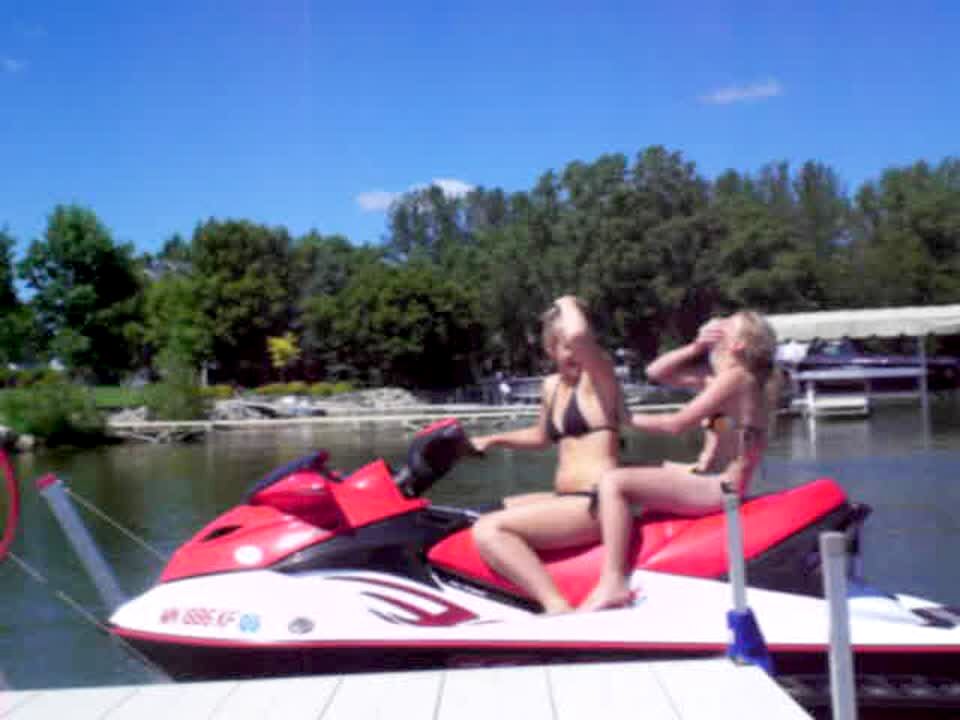 Teen girl in a bikini sits on jet ski on lake. Another girl hops on and they hit heads.