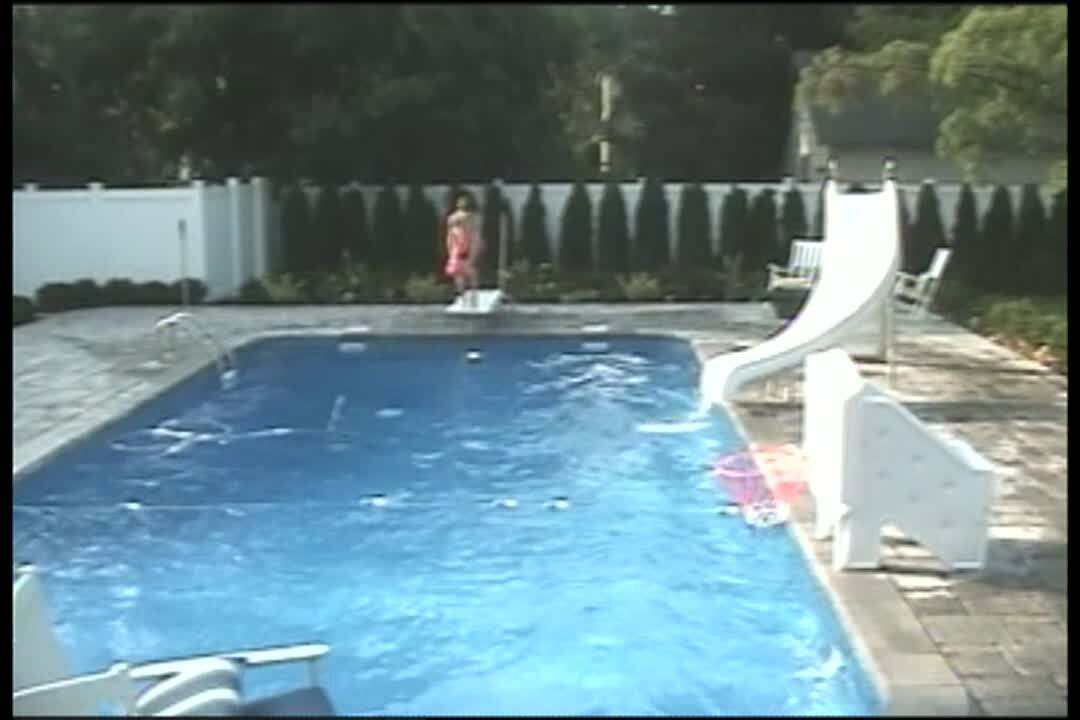 Young girl does backflips in an above ground pool & hits her head on the side of the pool. Good recovery.