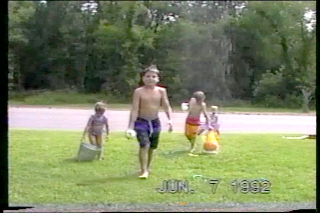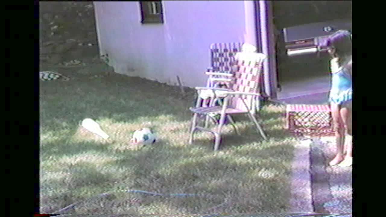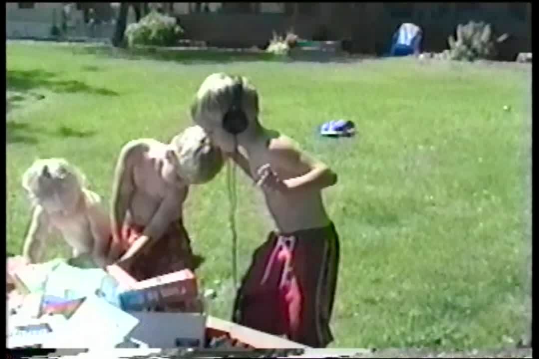 Backyard. Kid scubas in garbage can. (low audio)
