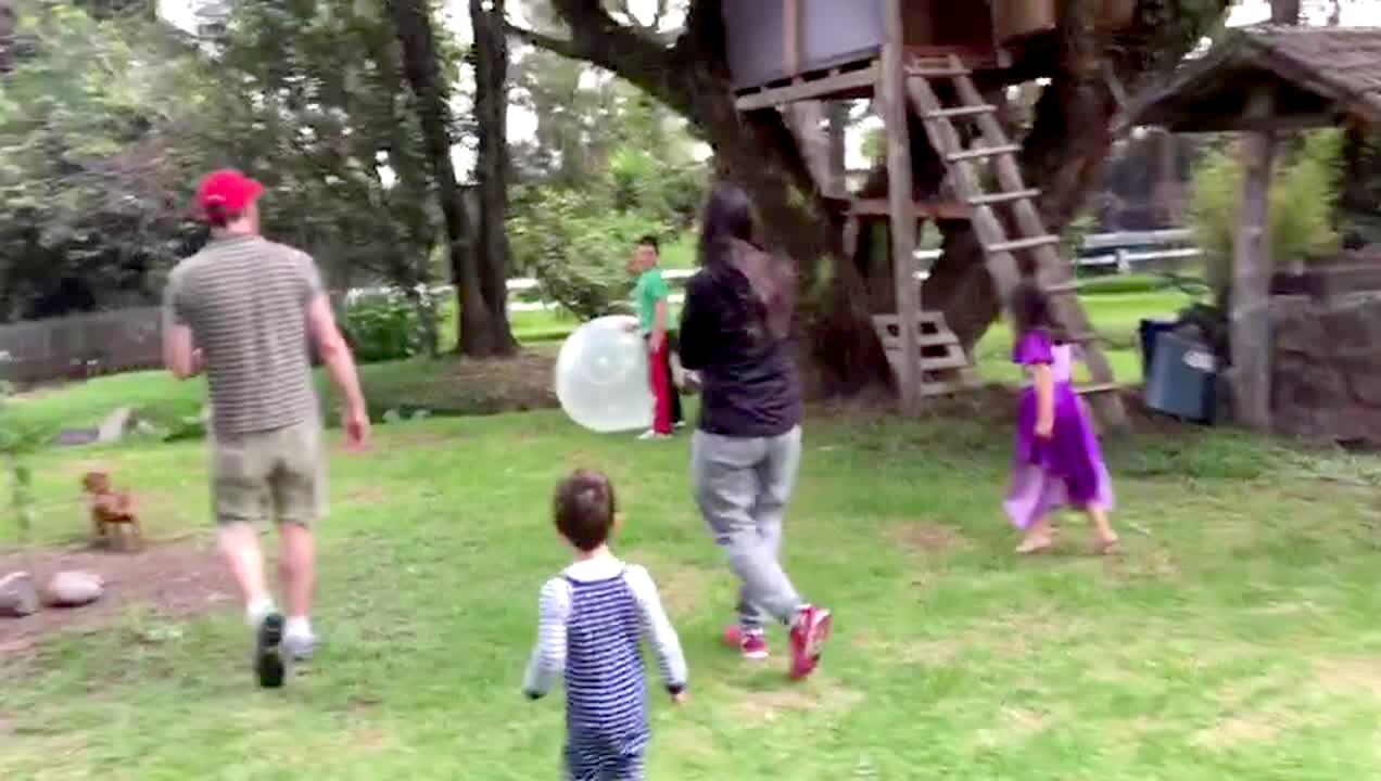 A girl and boy throw buckets of water and flour on their mom when she comes homes and opens the front door of a house. We don't see her get hit, but after a minute she walks in covered in flour and yells "what the F***."