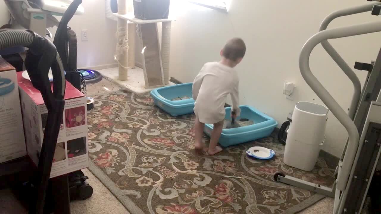 A tot boy plays in a litter box. His mom tells him not to touch the cat poop and he falls to the floor in surprise.