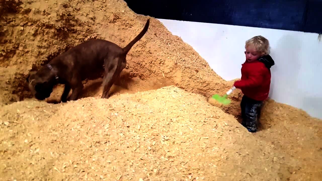 A dog digs in a dirt pile and flings it at a tot boy's face as he digs in the dirt with a shovel behind her in a barn.