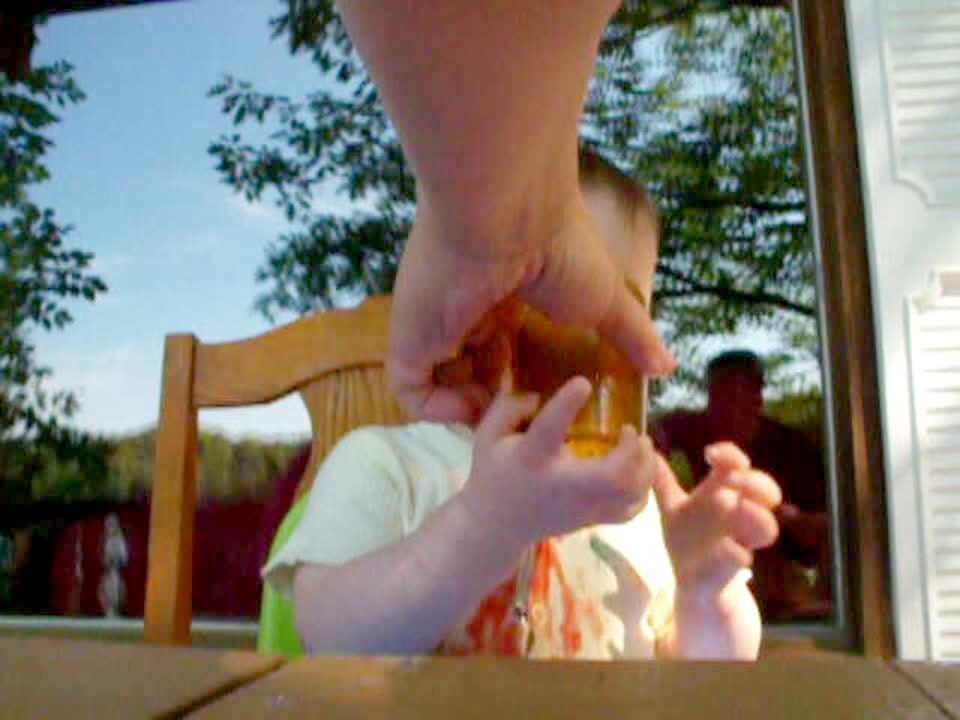 Boy & girl learn that their mom is pregnant. Boy jumps up and down, cheering. Girl pouts and cries. She throws her cup down and screams. Siblings.