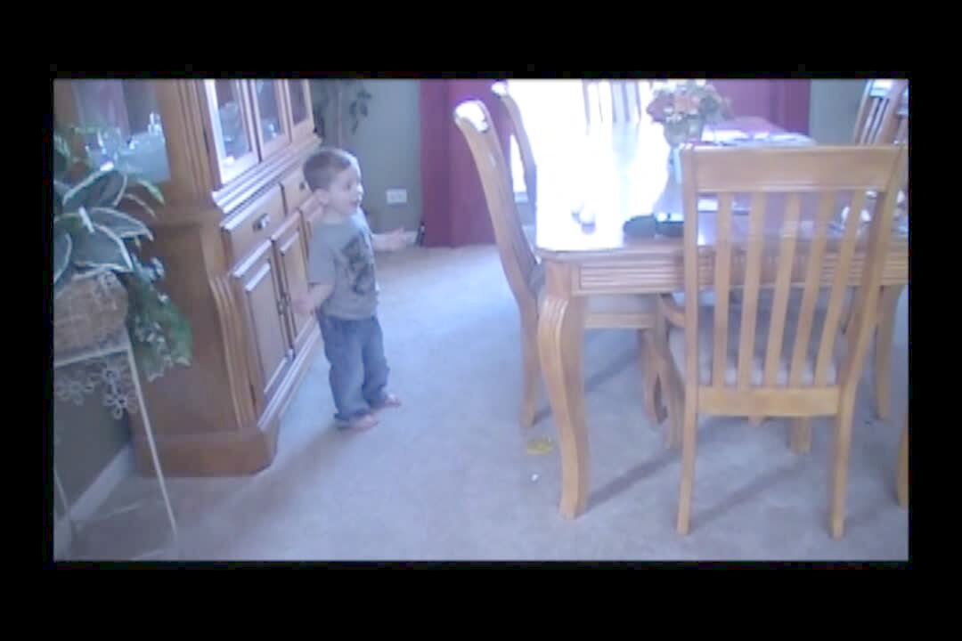 The woman behind the camera is furious when a boy tot is caught having broken eggs all over her living room and dining room.