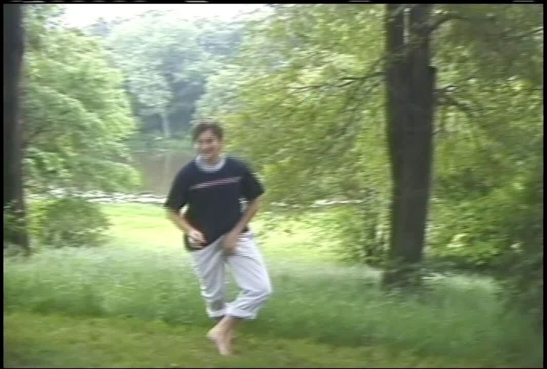 Teen boy tries to jump over a picnic table in backyard. He fails several times. On last try, boy slips & hits picnic table then falls to ground. No recovery.