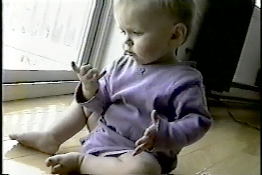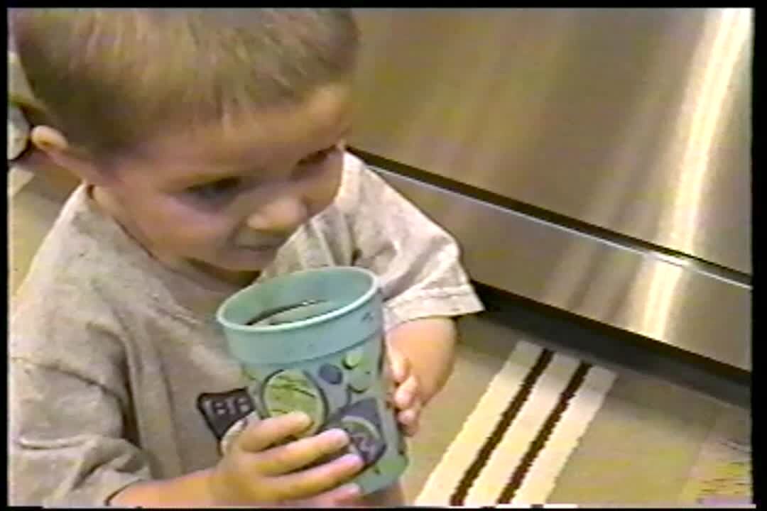 Mom gives tot boy soy sauce to drink. He drinks it, makes a gross face, spits it back up in the cup. Boy thought it was soda. Practical joke. Kitchen.