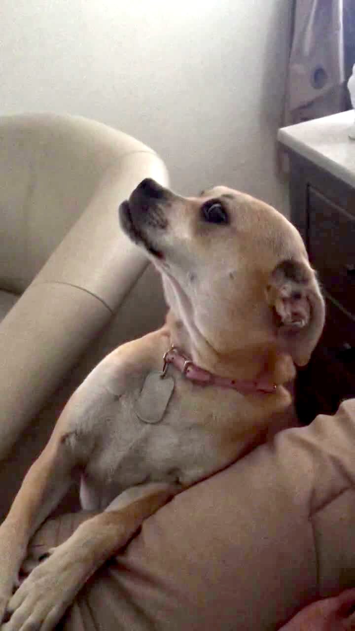 A woman introduces her black boxer puppy dog and explains that he had his first day home alone today. She then shows what the dog did today by filming her living room couches, which are completely torn apart, and a section of one couch has been pushed across the room.