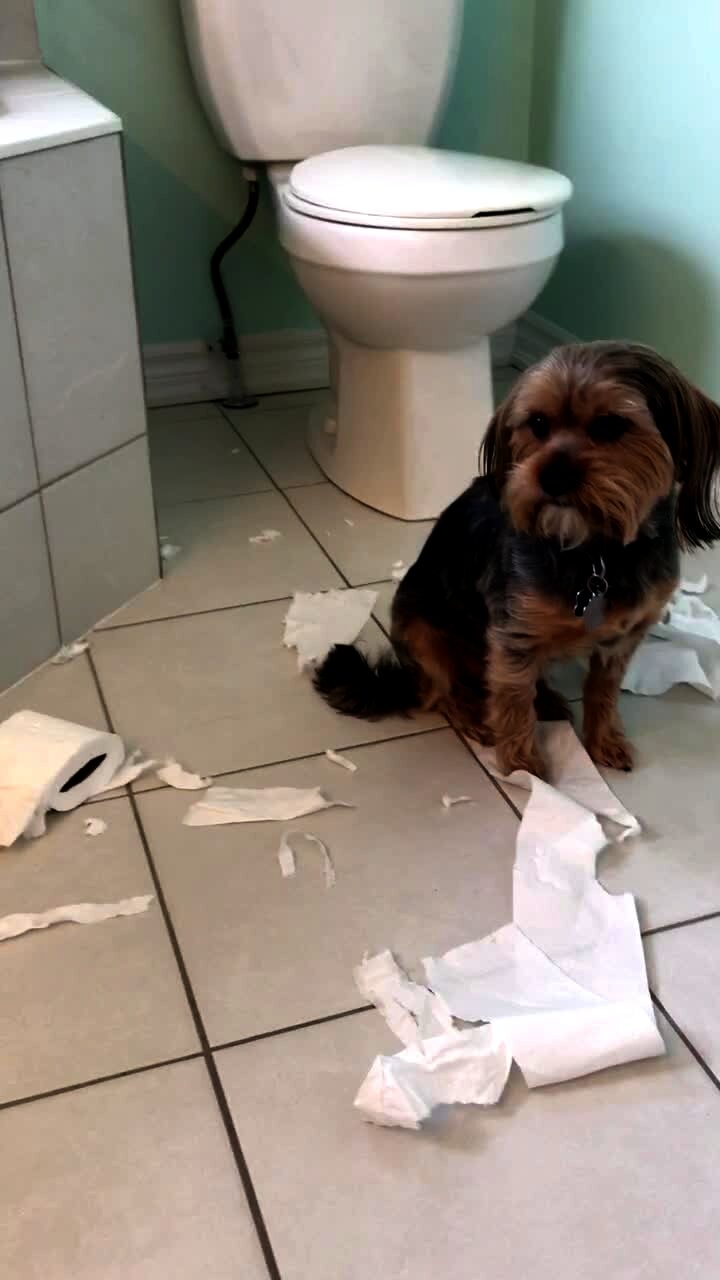 A dog sits in a bathroom, surrounded by torn up toilet paper. When asked if he did it, he hides behind the toilet.