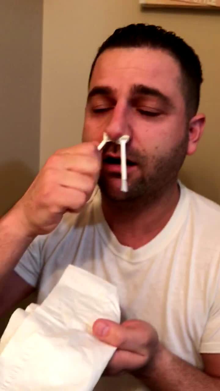 A man screams when he tries to pull a wax stick out of his nose but it does not come out, and then his wife pulls it out for him.