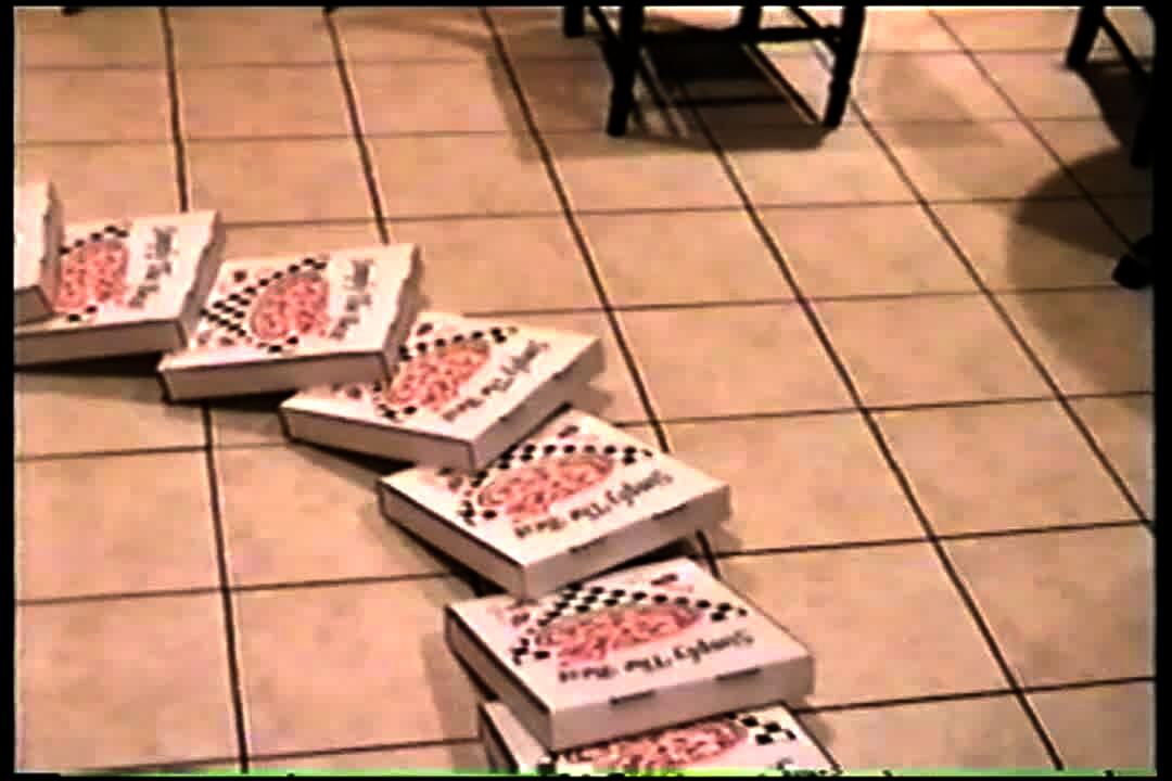 Teen boys in restaurant set up a domino chain with pizza boxes. The boxes fall perfectly with a statue of a man at the end.