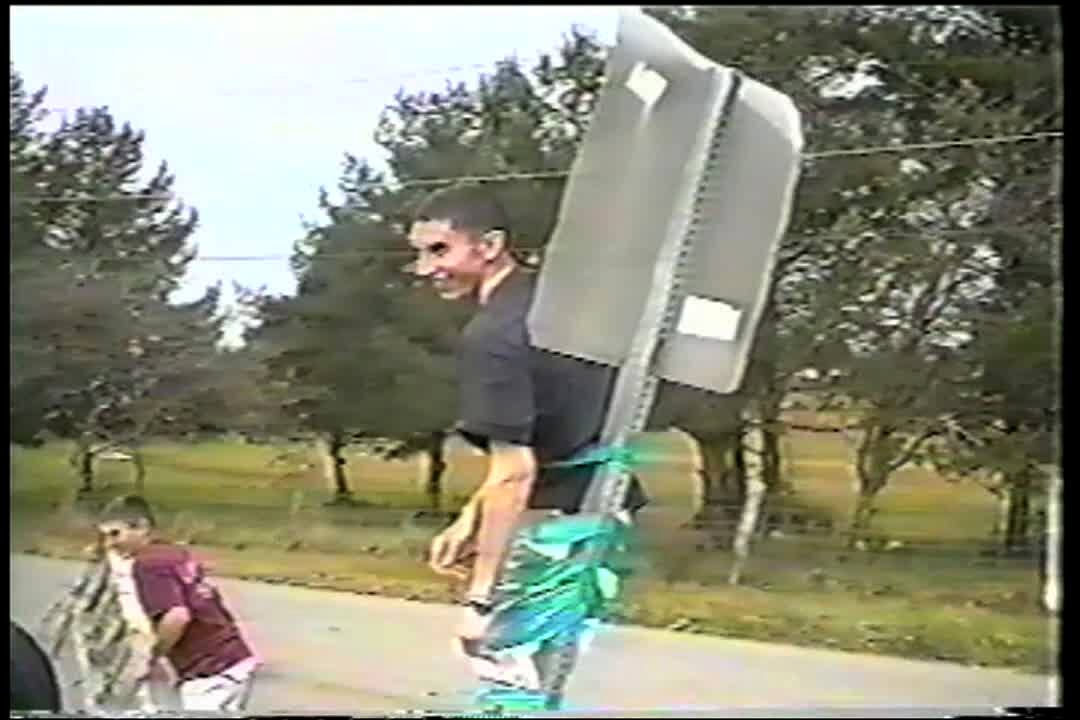 "Fruit Flinger" 2 teen boys build a trebuchet / catapult and launch a grapefruit through a camper window.
