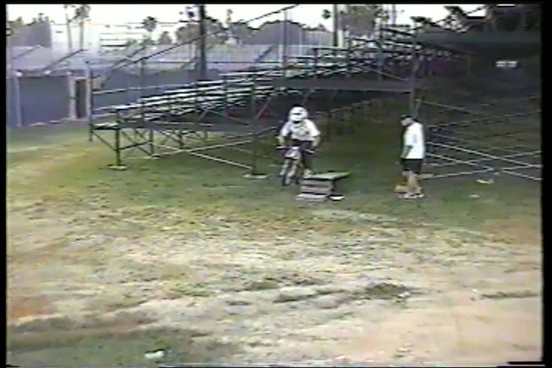 Shirtless teen boy rides bike in front yard, goes up ramp, comes down hard with bar of bike right between legs; groin / crotch hit. Stunt. Little brother is excited and screams into camera in close up. Tracking a bit off