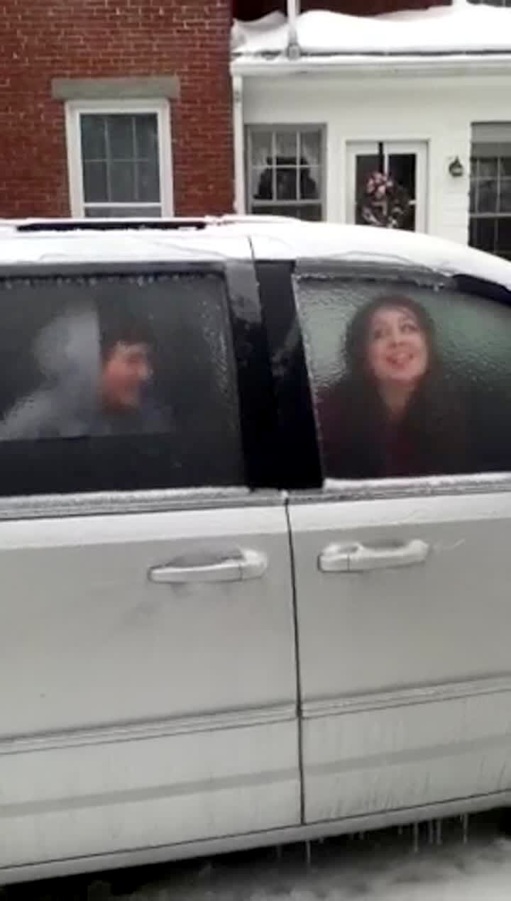 A teenage boy and a teenage girl lick sheets of ice where the car windows are supposed to be and smash their heads through from inside the car.