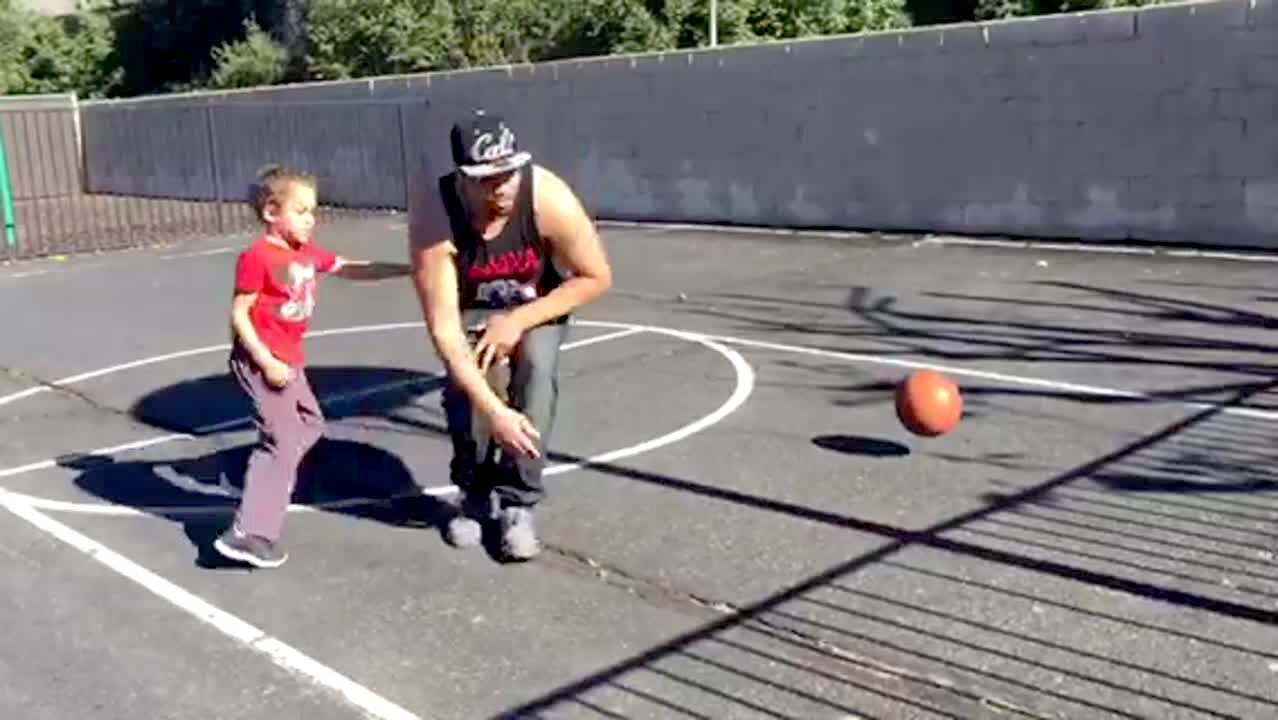 A man and a young boy play basketball. The man taunts the boy with the ball, then the boy punches the man and he is hit in the groin. He falls to the ground in pain. Tells the person with the camera to stop recording.