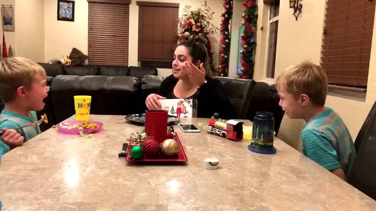 Two boys yell and cry when their mom shows them a new Elf on the shelf. They are afraid of it.