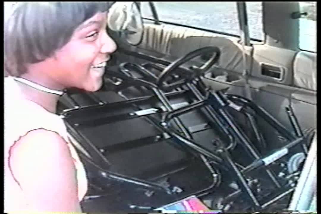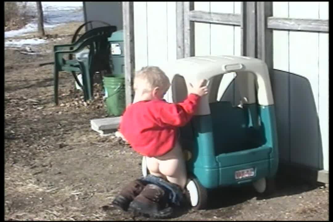 Young boy tries to pee into the gas tank of his toy car. Grandma / senior woman asks what he's doing, boy says he's "Filling up the gas." Kids say.