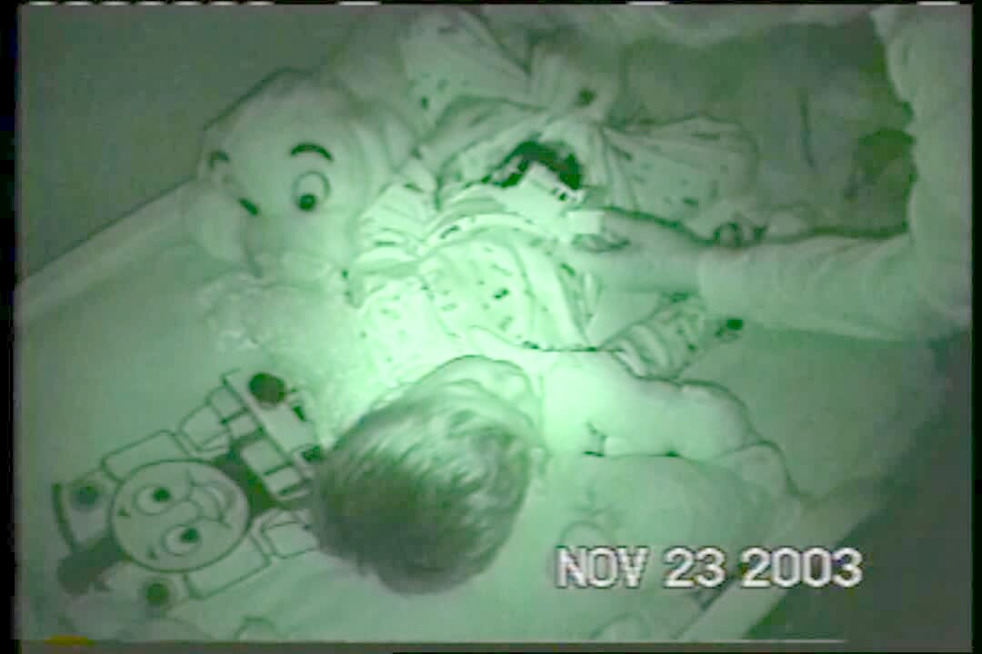 Young boy sleeps in his cribs & mom pulls several toy trains from down the front of the boy's pants.
