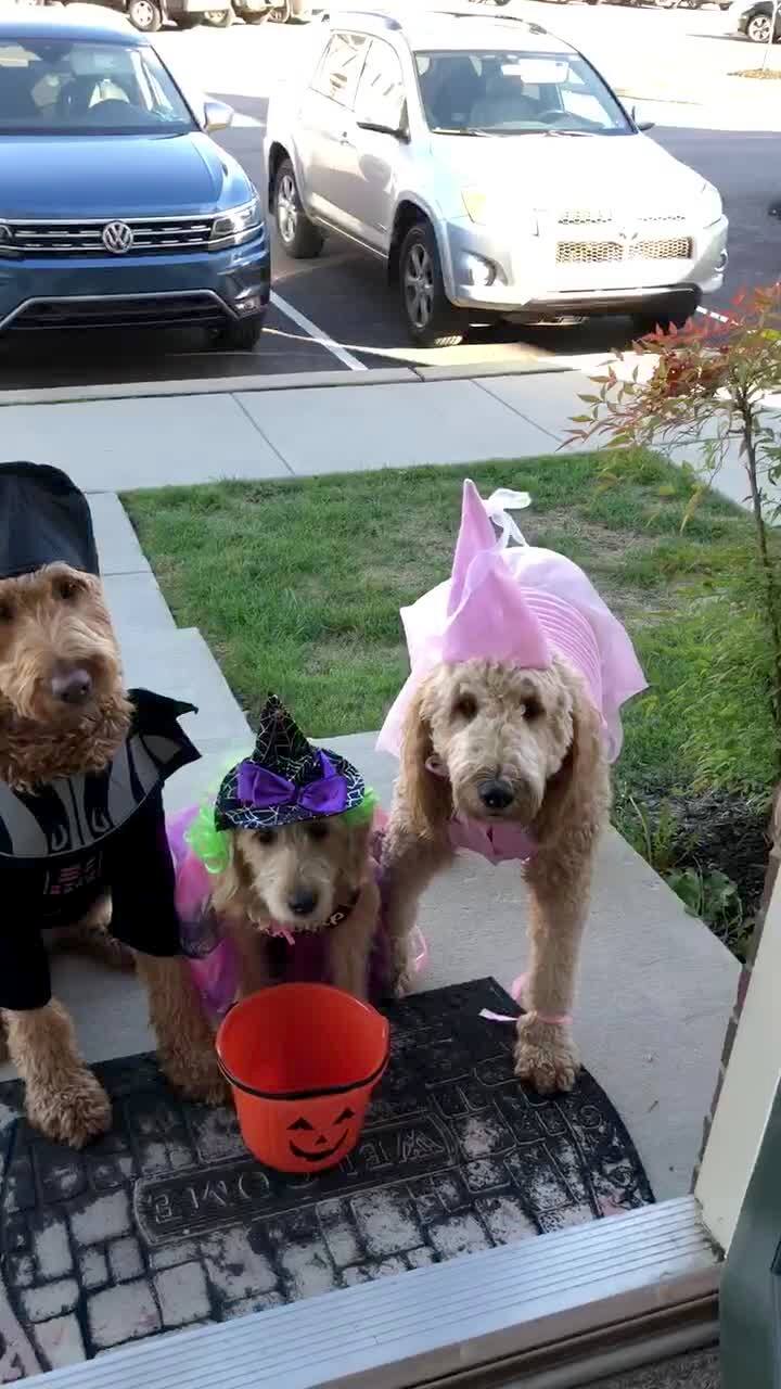 A woman opens the door to find three Goldendoodle dogs in Halloween costumes with a bucket for candy.
