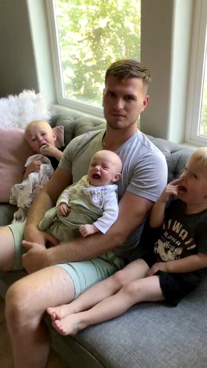 Two tot boys and a baby boy all start to cry at the same time while a man sits with them on the couch, so he pretends to cry too.
