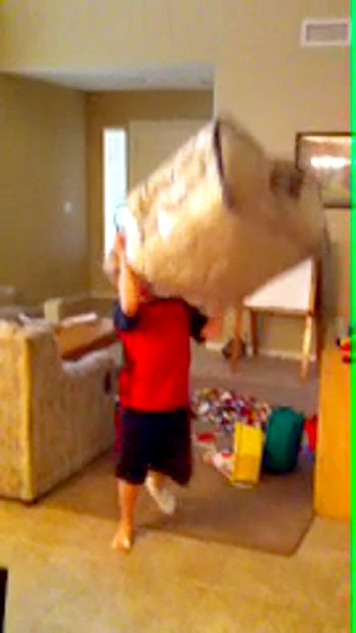 Boys try to catch a quilt in a bag that is thrown from second story. One boy gets hit hard at 0:42.