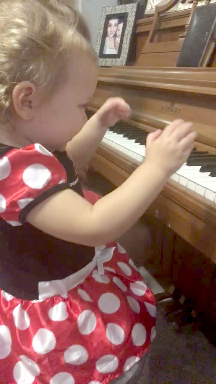 A tot girl sits at a piano in the living room and a woman tells her to tickle the ivories, so she pretends to tickle the keys.