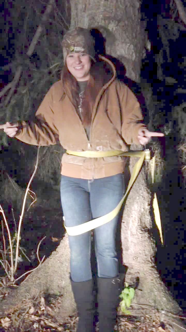 A man and woman tickle a woman tied to a tree outdoors at night. Toys for Tots Tickle Challenge