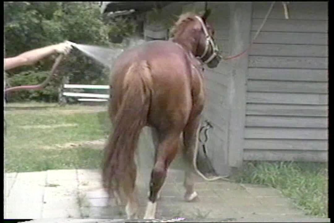 A horse uses his mouth to tickle a young woman's ear at a stable while she tries to cut the horse's hair, and she screams.