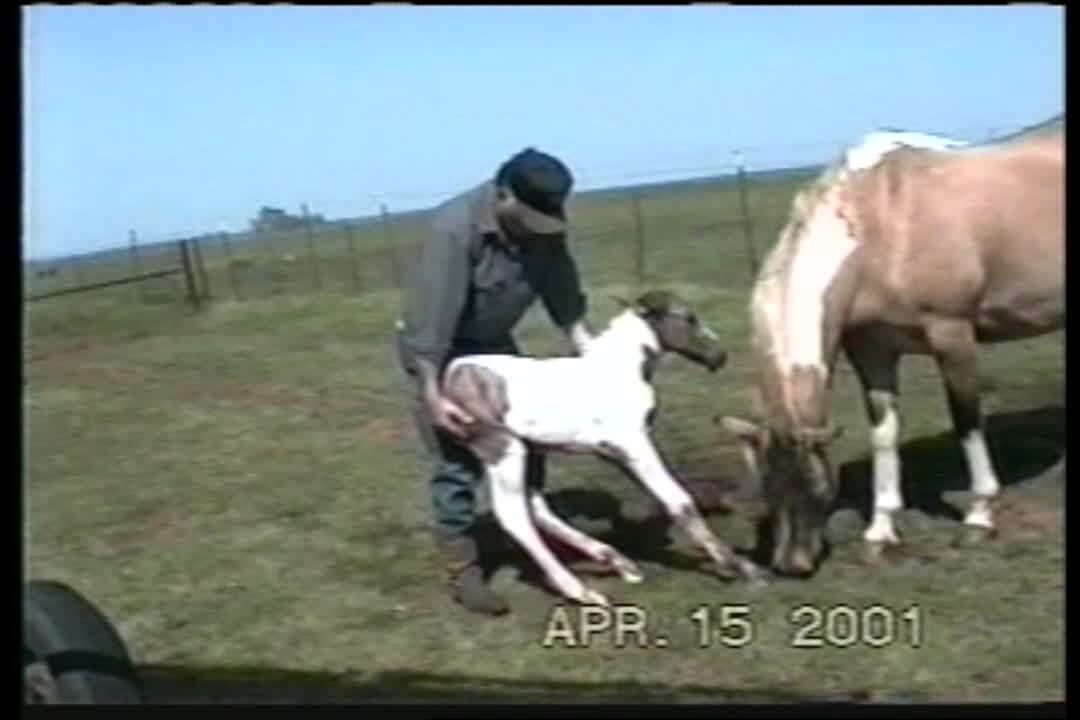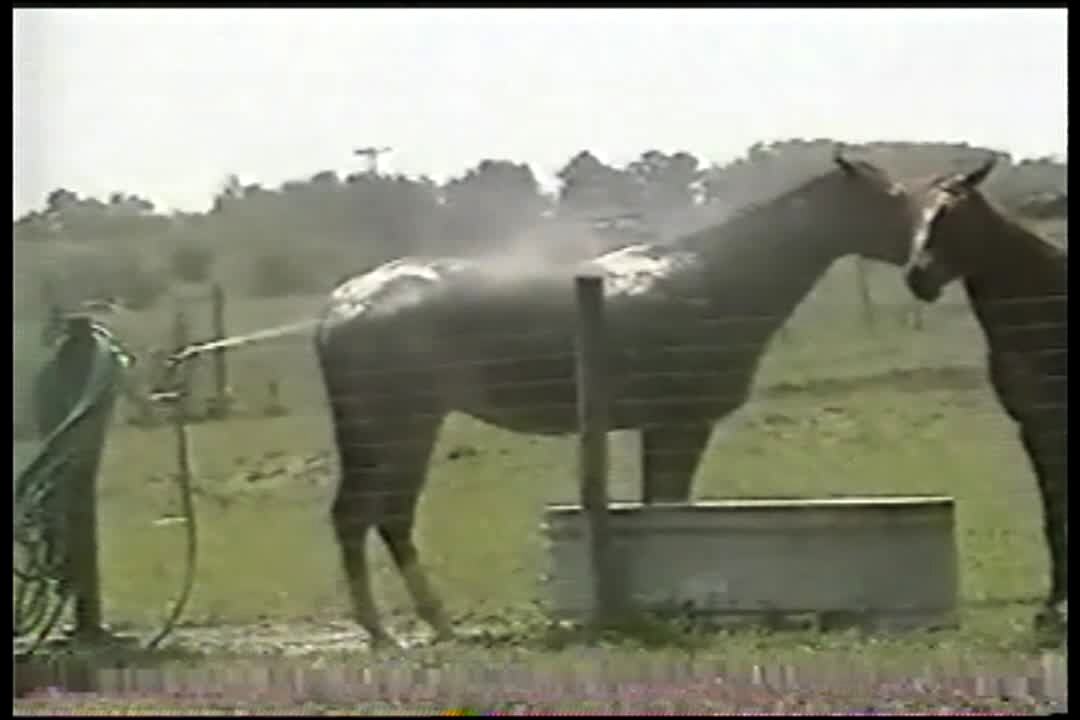 Horse puts its butt right up to the nozzle of the garden hose that is spraying water. Washes its butt. Enema