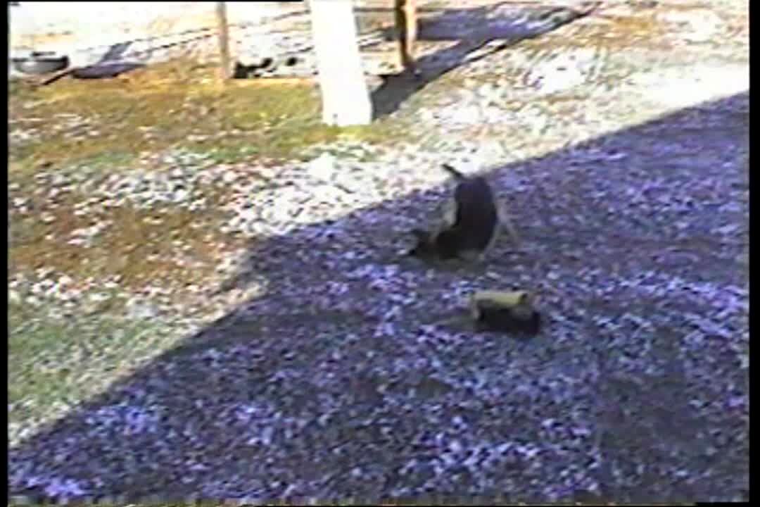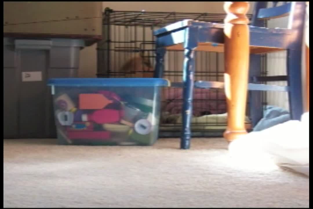 Small dog locked in a cage lifts the cage up with its mouth until a space exists at the bottom, then the dog squeezes itself underneath & gets out. Animal escapes. Hidden camera.