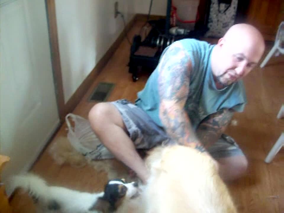 Man grooms a lab dog, small dog helps out by biting at loose hairs that come off lab's fur.
