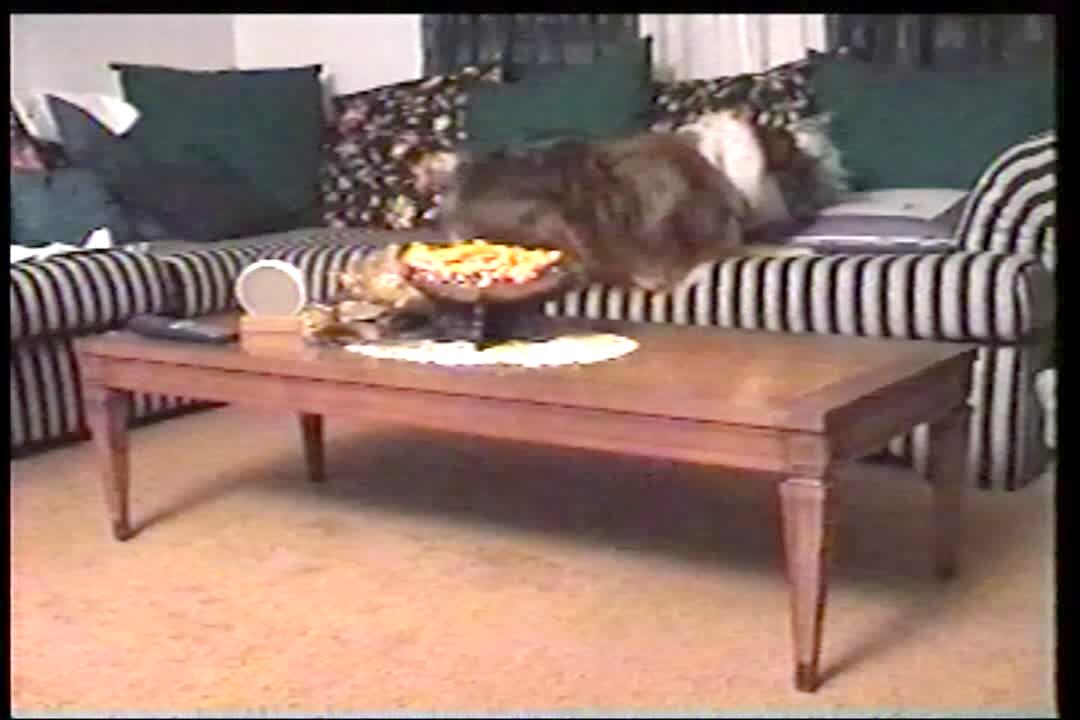 Dog runs around coffee table and knocks down cat sitting on couch. Several times, no sound