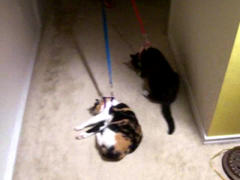 Two cats are on leashes and laying on the ground, refusing to walk. Man drags them across the floor, pulling their leashes.