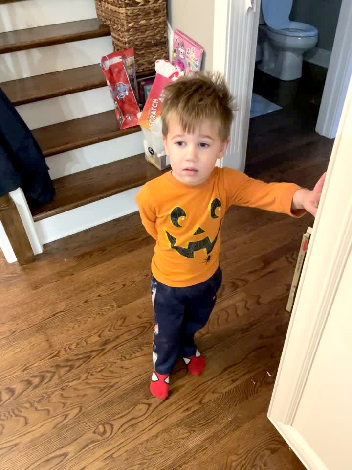 A tot boy walks into a kitchen and says he can't find his lollipop after a nap. A woman asks him to turn around. The sucker is stuck to his back. Halloween