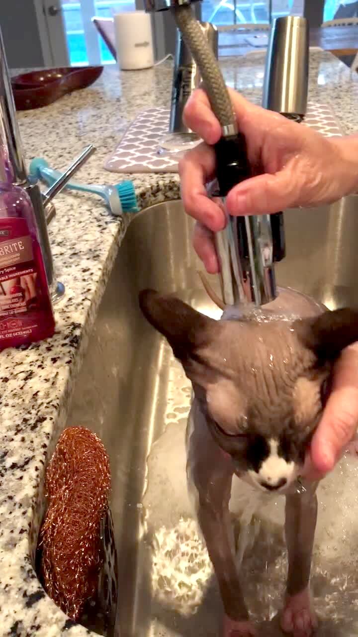 A hairless cat makes a mad face as a woman washes him in the sink.