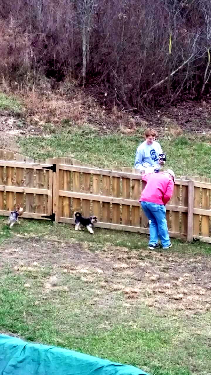 A tot boy stands on a backyard porch and touches a frog, but is scared. It jumps on his head and he screams "get it off". His dad laughs hysterically, and the boy laughs and high-fives him.